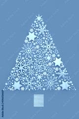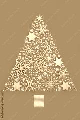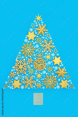 Christmas tree concept shape with gold bauble decorations, snow, star and snowflake decorations on blue background. Surreal abstract symbol for festive season.
