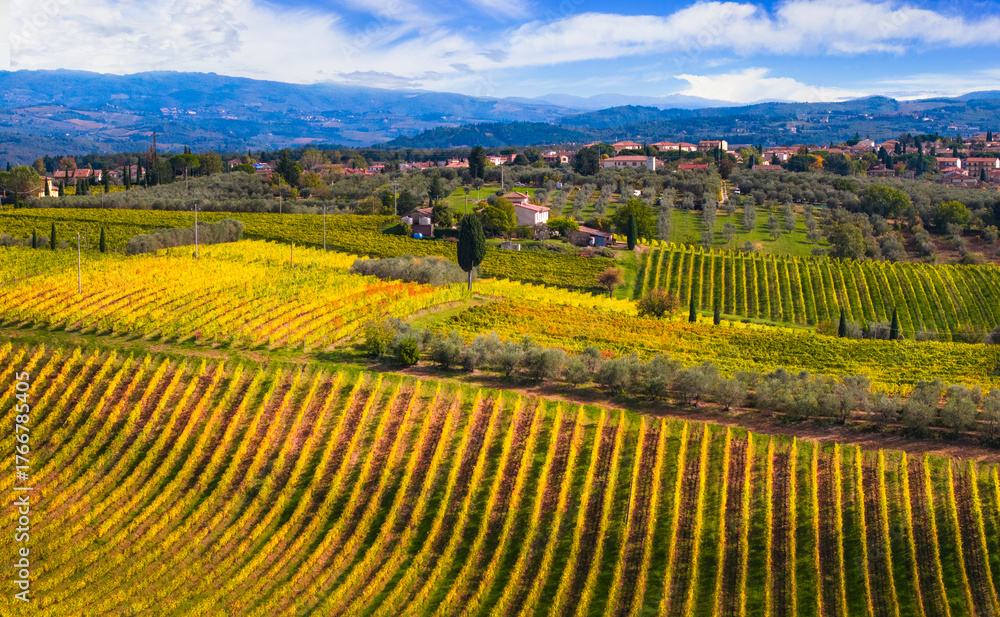 Idyllic tuscan countryside. colorful autumn vineyards fields and cypresses. Tuscany scenic landscape , Italy, Chianti region