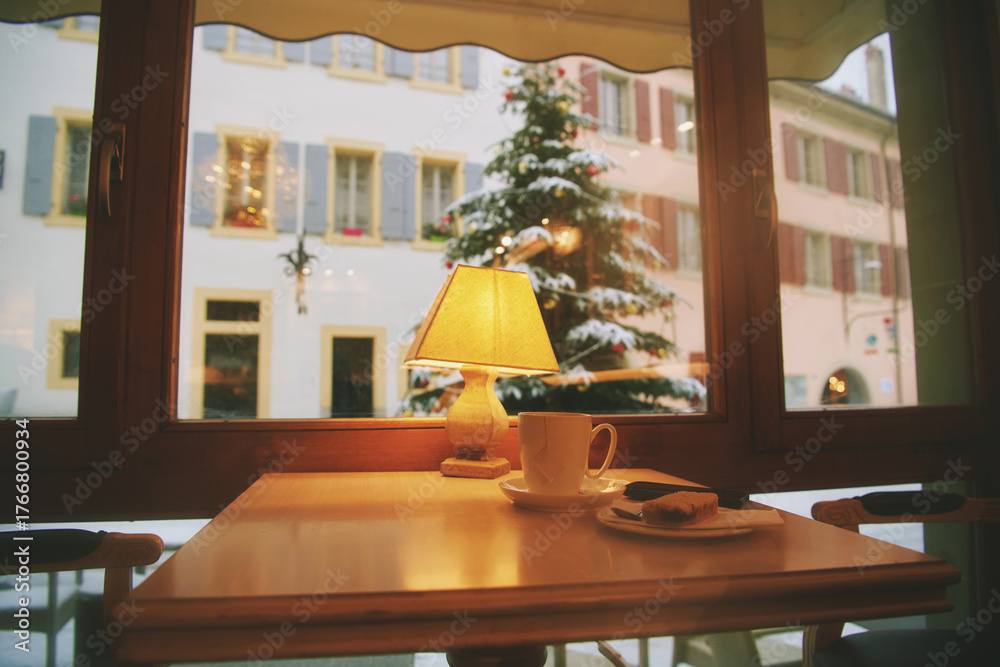 Christmas mood, table at cafe with cup of tea and cake, placed next to window with visible decorated Christmas tree