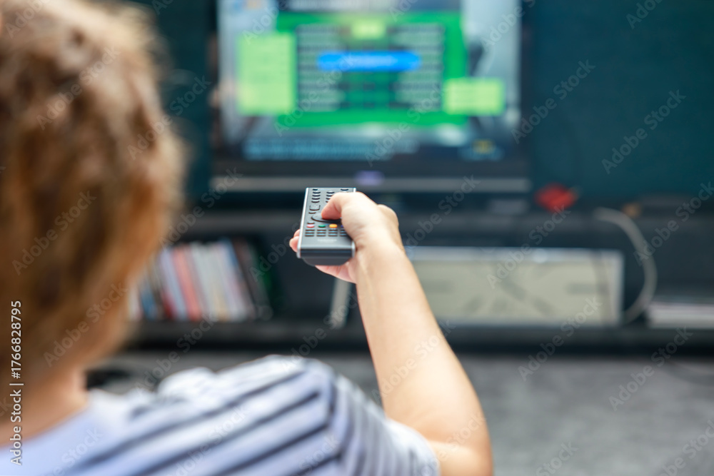 Woman holds remote control while watching TV in living room