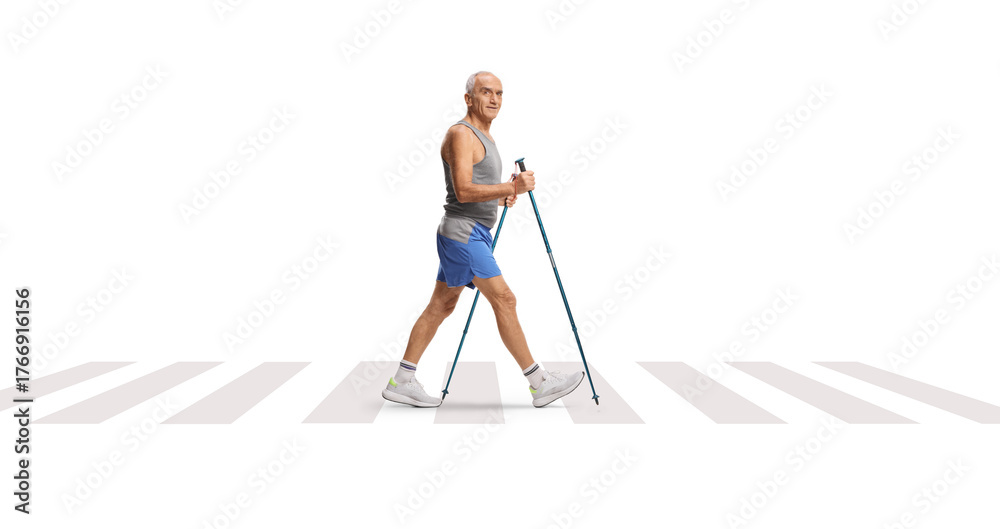 Fit elderly man in sportswear walking with trekking poles at zebra crossing