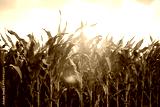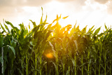 Corn field at sunset with warm golden sunlight and green leaves in summer rural landscape