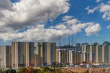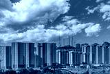 Modern buildings in the Yenimahalle district with tall antennas and a dramatic sky in the background, Ankara Türkiye