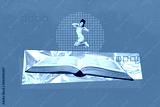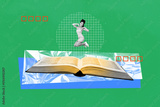 Full image photo collage of happy girl jump library encyclopedia book stack bookworm hobby literature school subject homework