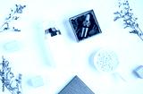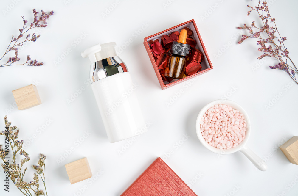 bottle placed, Blank label package for mock up on white background and flowers. The concept of natural beauty products.