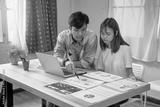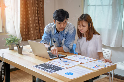 teamwork, Young businesswoman in office in casual shirt. Selecting information with colleagues with a computer on the table. Business Marketing Planning