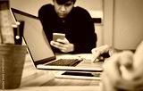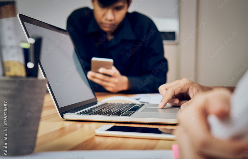 teamwork, Young businesswoman in office in casual shirt. Selecting information with colleagues with a computer on the table. Business Marketing Planning