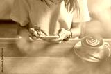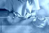 Young girl holding a white phone has a blank screen in cafe, And coffee on the table to make life more relaxing. The use of technology for a happy life.