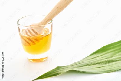 Honey glass and spoon have round shape for easy mixing. for mockup on white background. The concept of natural beauty products.