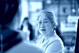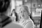 Senior woman passenger face at airport check in counter service with air ground staff foreground , Travel by airplane service.
