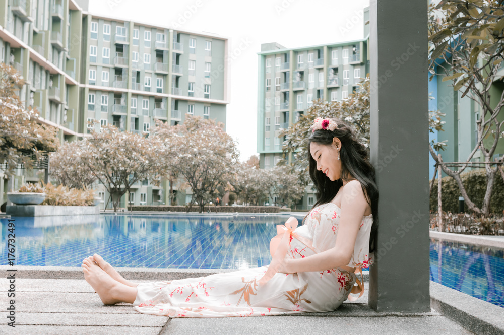 beautiful pregnant women sitting and relaxing at swimming pool in park.