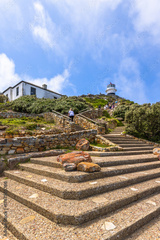 A lighthouse sits on top of cliffs of Cape Point in the Cape of Good Hope Nature Reserve on southern tip of the Cape Peninsula in South Africa. The Atlantic and Indian oceans converge at Cape Point.