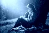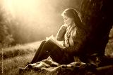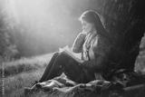 Beautiful young brunette sitting on a fallen autumn leaves in a park, reading a book