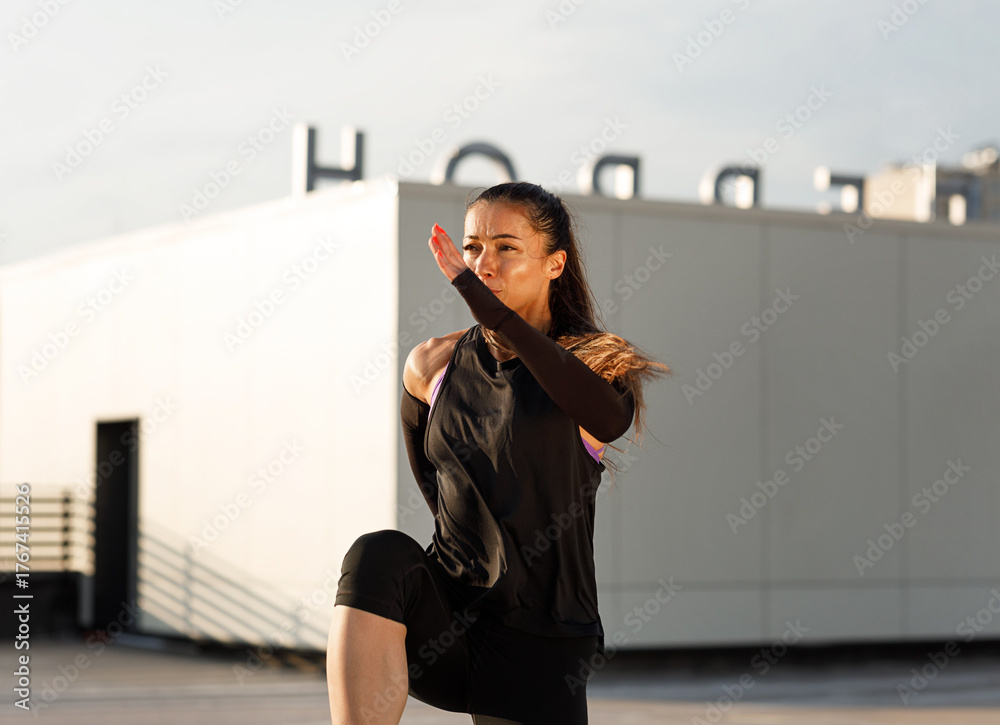 High angle of a slim sportswoman exercising with medicine ball outdoors. Muscular female athlete practicing core workout.