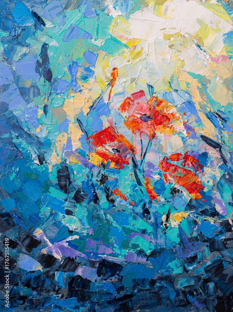 Red poppies growing in a field with blue and purple flowers