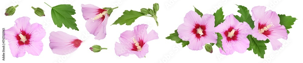 Pink hibiscus flower isolated on white background. Top view with copy space for your text. Flat lay.