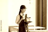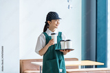 コーヒーカップを持つエプロンをつけた女性カフェスタッフ