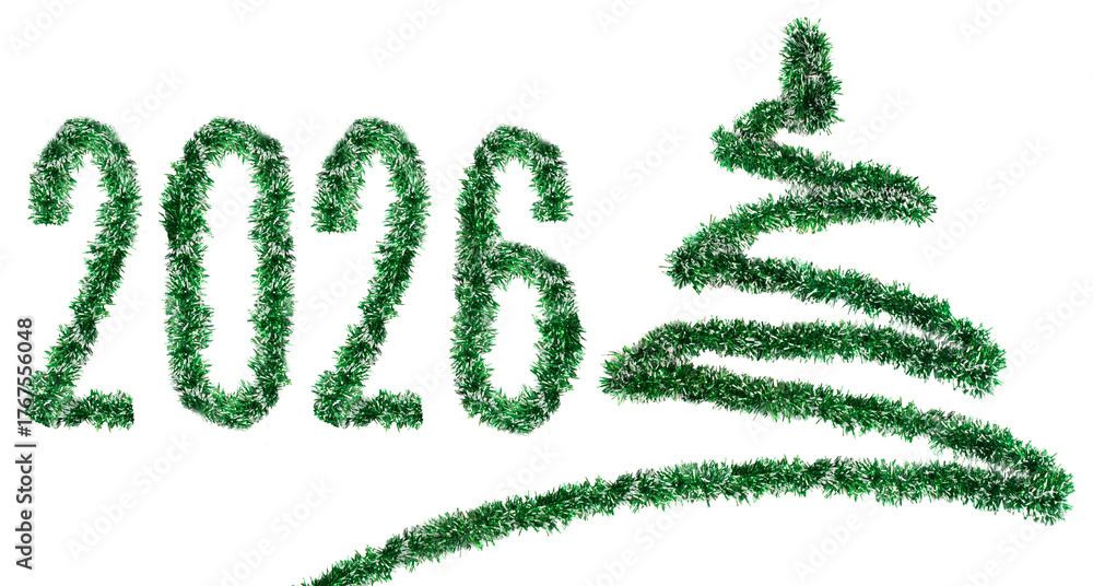 New Year's celebration 2026 with green tinsel design showcasing a festive tree outline