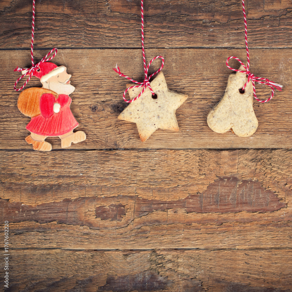 Homemade Christmas Cookies with Festive Decorations on Rustic Wooden Board