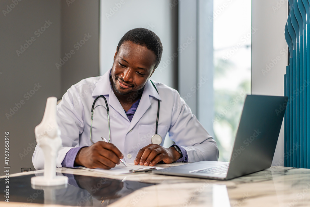 Young doctor man working at office workplace, reading medical record, paper document at laptop, reviewing patient history, sitting at table with laptop computer, working in clinic office