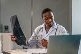 Medical doctor male analyzing patients roentgen and writing results in clipboard, The patient's symptoms from the X-ray and the results are reported online via video conferencing in laptop computer