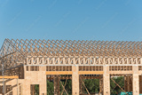 Close-up roof wood frame house under construction with foundation in Humble, Texas, USA. New stick built framing one floor commercial building. Pile of beams, log, sand, gravel. Industrial background