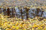 Autumn leaves floating on rain puddle with tree reflections urban park walkway quiet mood after shower