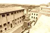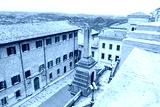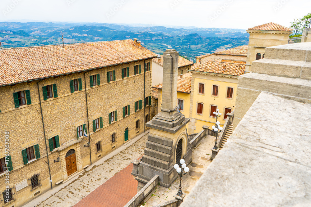 Republic San Marino old street architecture in center city. Houses wall, tiled roof and windows square. Top view mountains