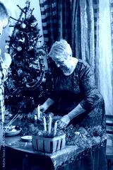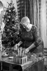 Senior old woman crafting. Make Christmas tree wreath and candles compositions. Home decoration in December DIY. Grandmother hobby