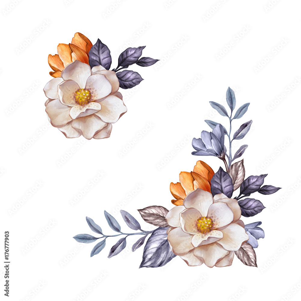 watercolor botanical illustration, autumn flowers, dried leaves, corner decoration, floral design elements set, fall, clip art isolated on white background