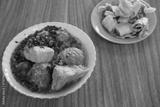 A bowl of Indonesian bakso soup containing meatballs, tofu, and broth, garnished with chopped green onions. A plate of fried wontons is in the background.