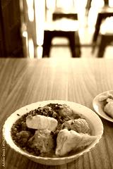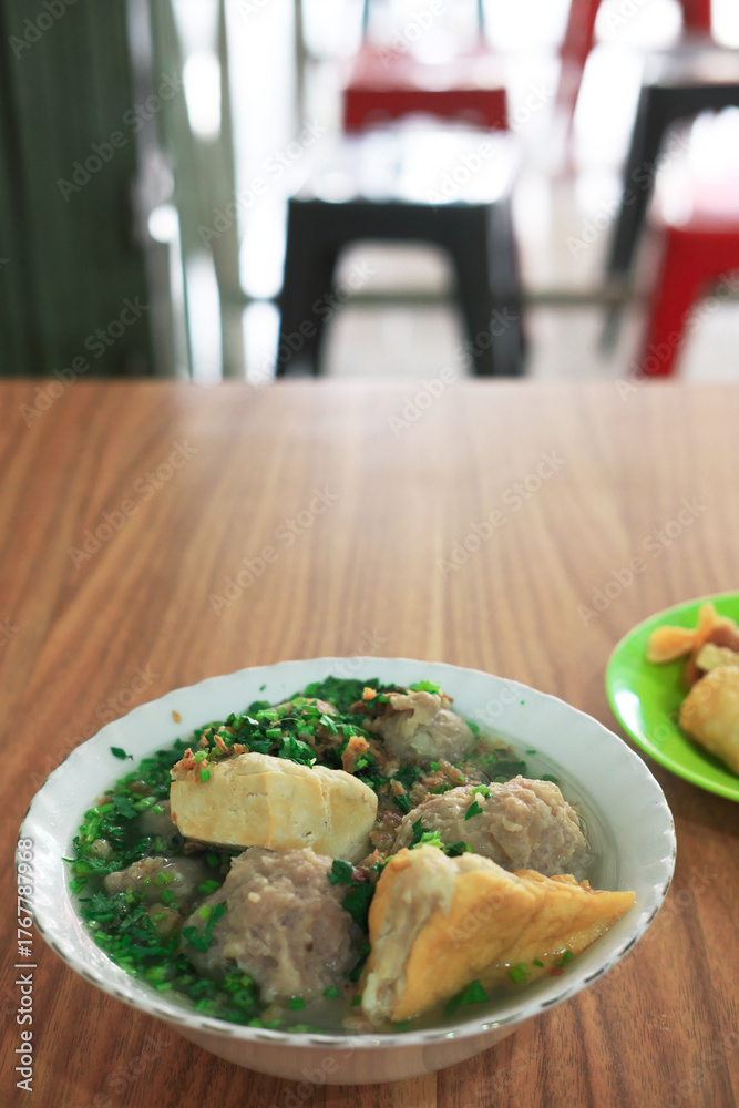 A bowl of bakso, Indonesian meatball soup with tofu and green onions, on a wooden table. A blurred eatery interior with stools is visible in the background.