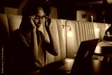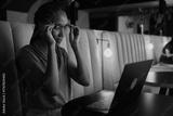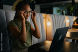 Focused young black businesswoman putting on glasses with laptop at desk in office lounge