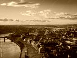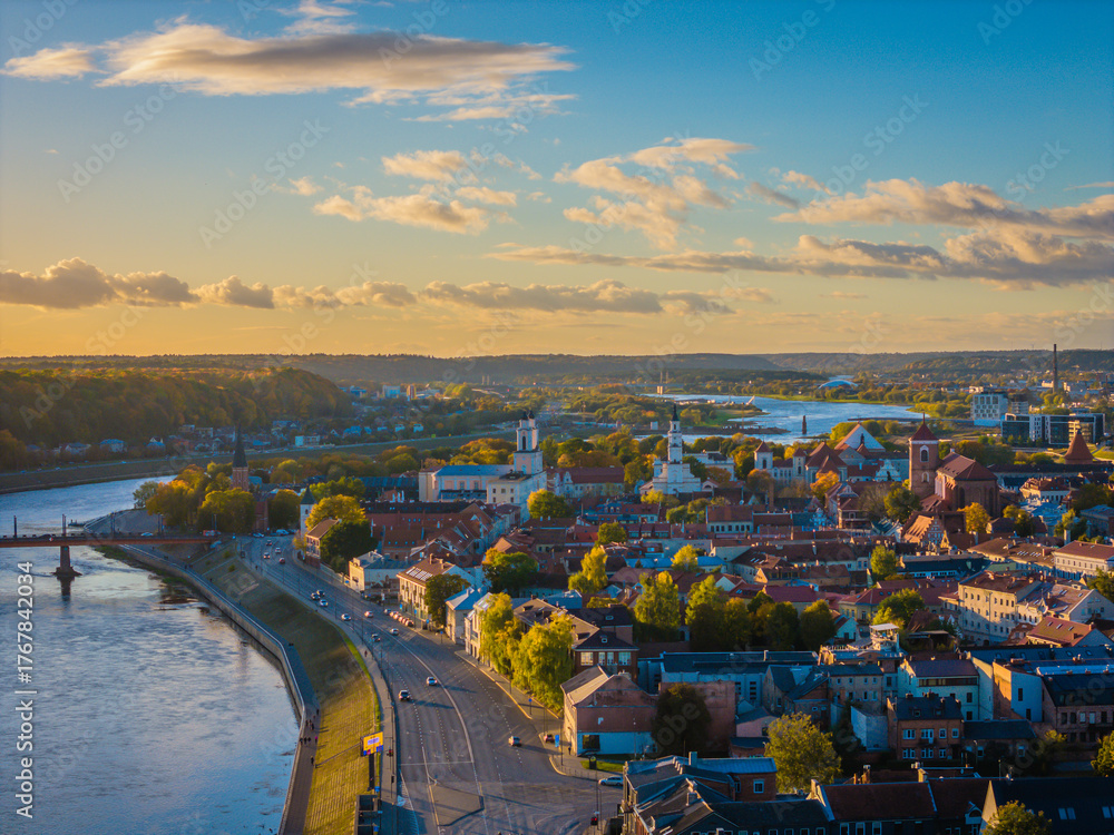Kaunas old town and modern new city center in autumn, Lithuania. Aerial drone view on golden hour