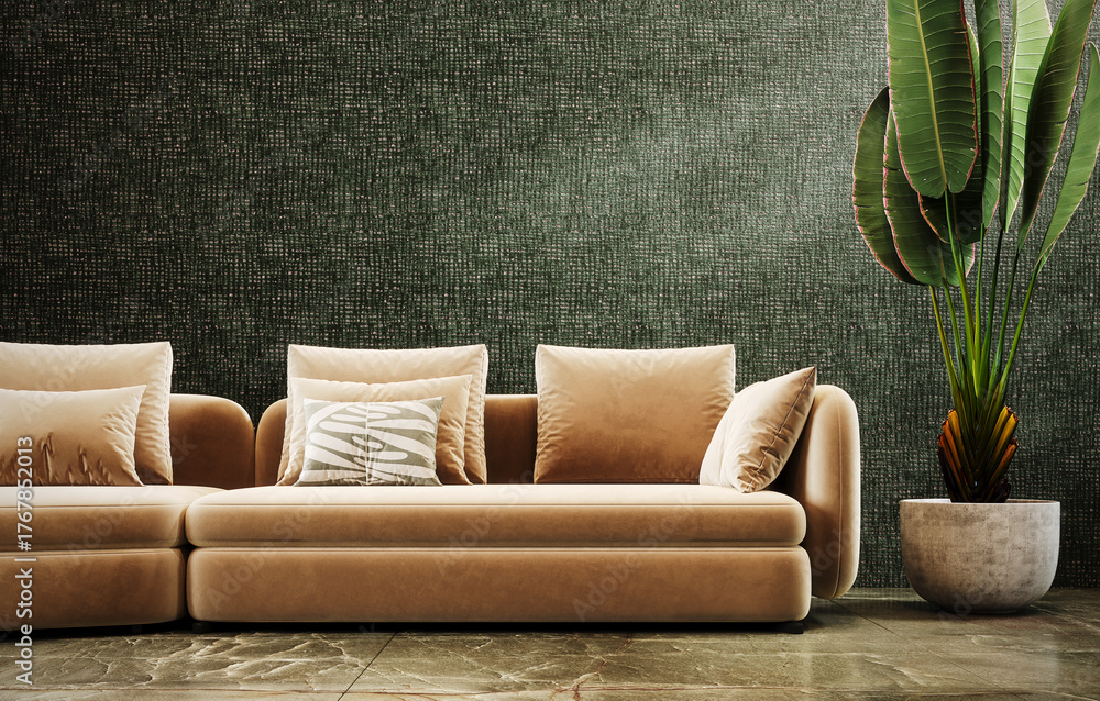 Modern living room interior design. Beige sofa on green wallpaper wall background. 3D Rendering, 3D Illustration