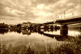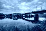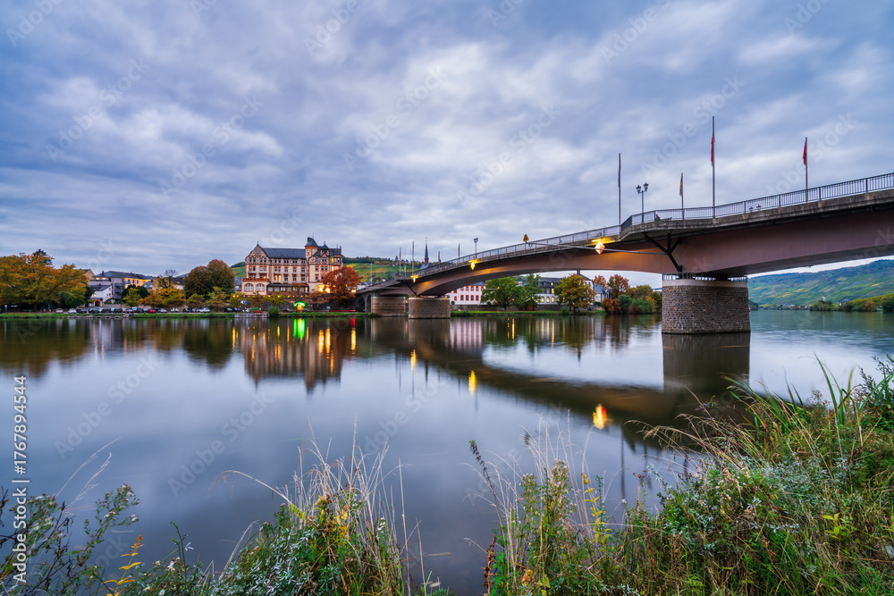 Skyline of Bernkastel-Kues town Moselle river bridge at dawn. Germany