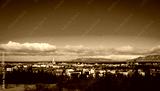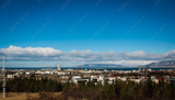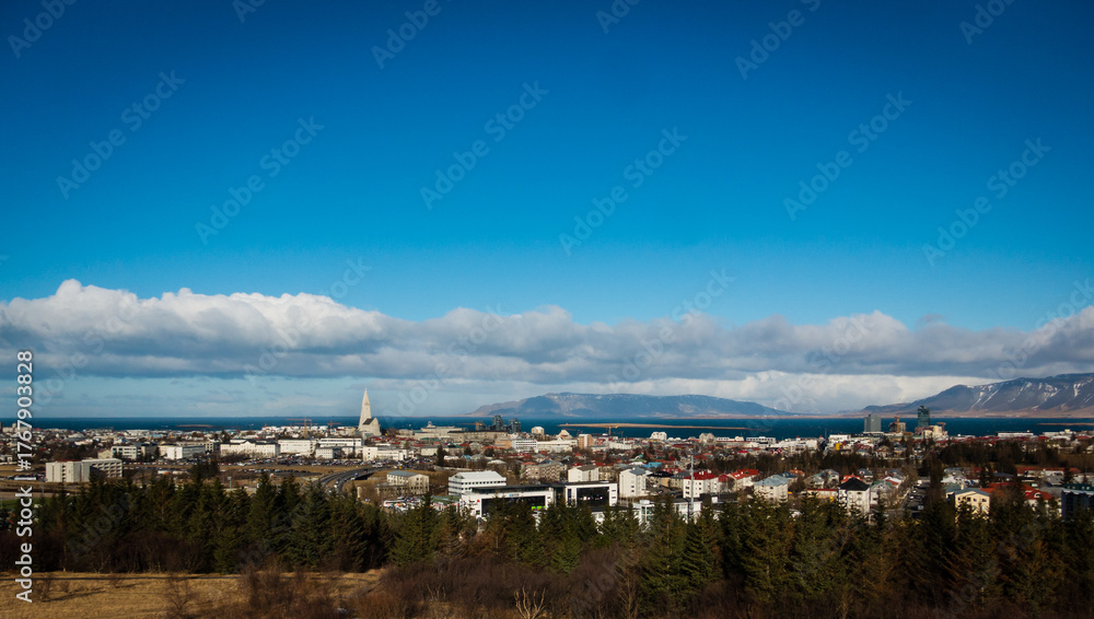 Reykjavik, Iceland, panoramic city view with Hallgrimskirkja and ocean in background