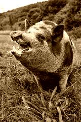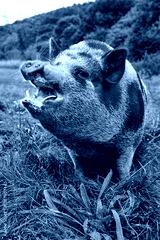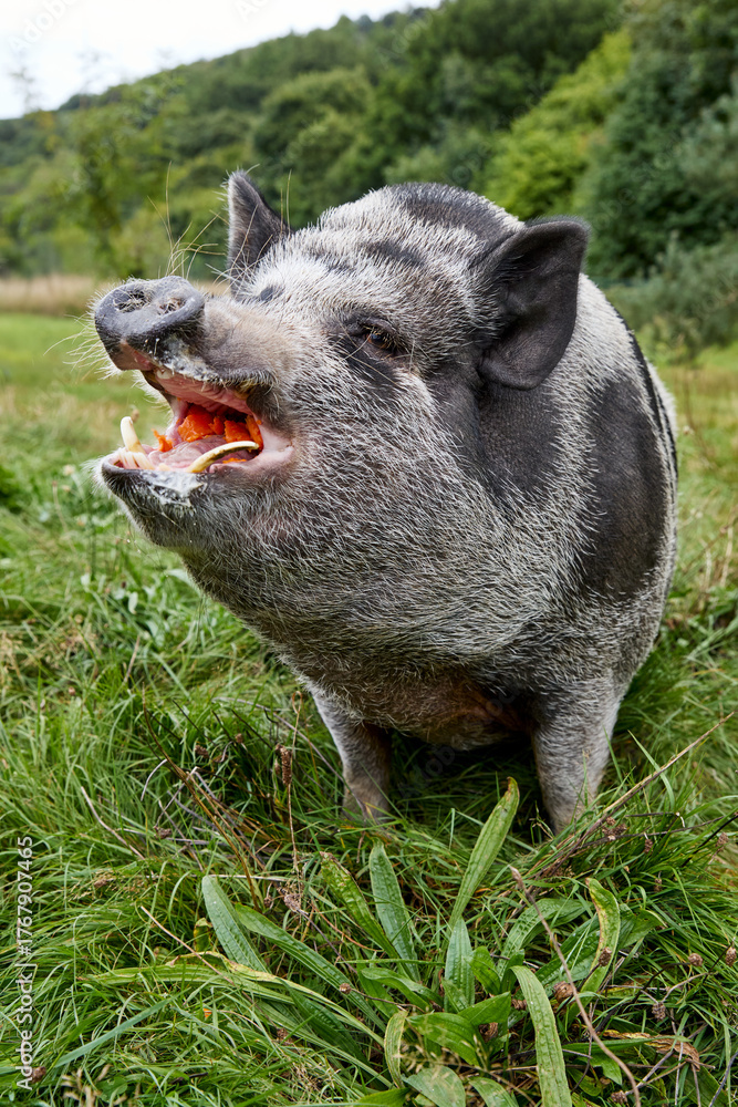 Cochon domestique mâle gris tacheté issu d'un croisement Kune kune et vietnamien dans un jardin particulier avec herbes et gazon