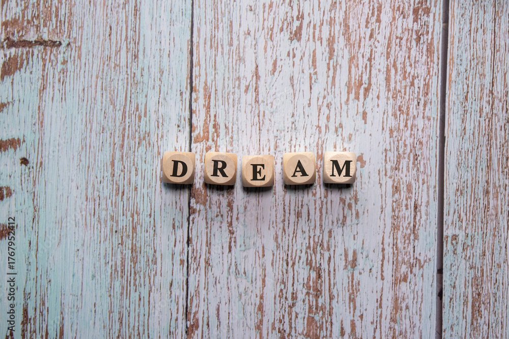Letter cubes forming the word “Dream” on a bright peeling wooden background, symbol of dreams and inspiration