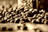 Aroma coffee chocolate cookies and spices on the wooden table. Dark wooden background. Top view. Close. Closeup.