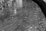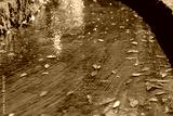 Long lines of swaying green Algae on a riverbed dance below dotted golden brown autumn leaves riding above on the gentle surface currents of a small stream.