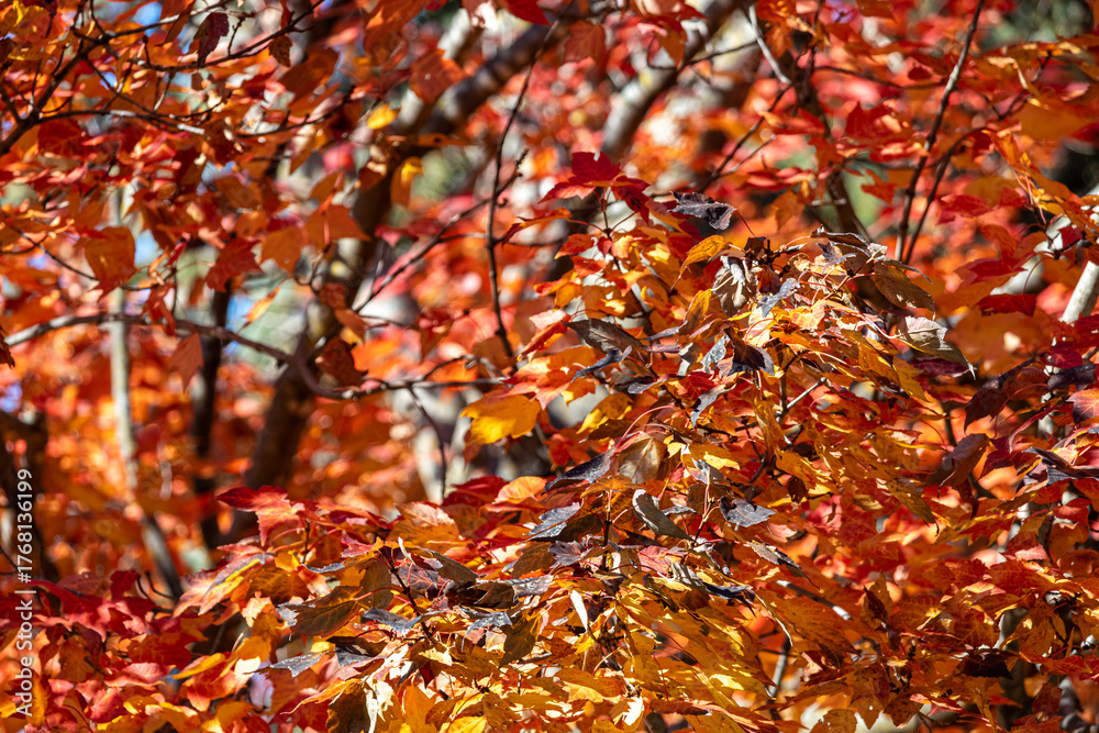 Abstract texture background of bright autumn color maple leaves in motion with a light breeze