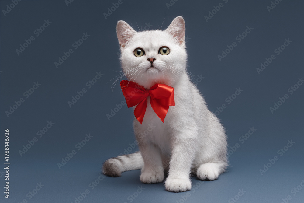 Studio photo of a fluffy silver-white kitten with bright green eyes and a bright red satin bow. It is sitting on a dark blue-gray background, staring intently at a point.