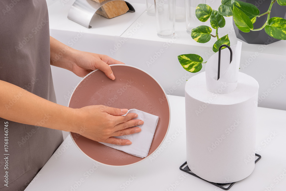 Women's hands wipe a raw plate with a paper towel in the kitchen interior. Horizontal photo. Close-up