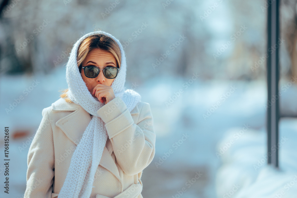 Woman Feeling Cold Coughing During Winter Time. Sick lady sneezing suffering from grippe not feeling well