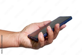 PNG file A hand holding a mobile phone, emphasizing technology and connection on transparent background PNG