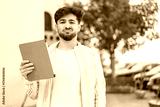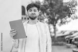 Handsome Arab man holding a tablet at outdoors with sad expression