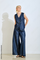 Stylish woman poses in denim outfit with elegant accessories against a clean backdrop