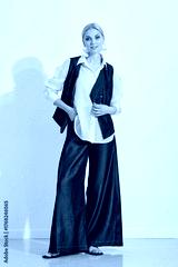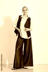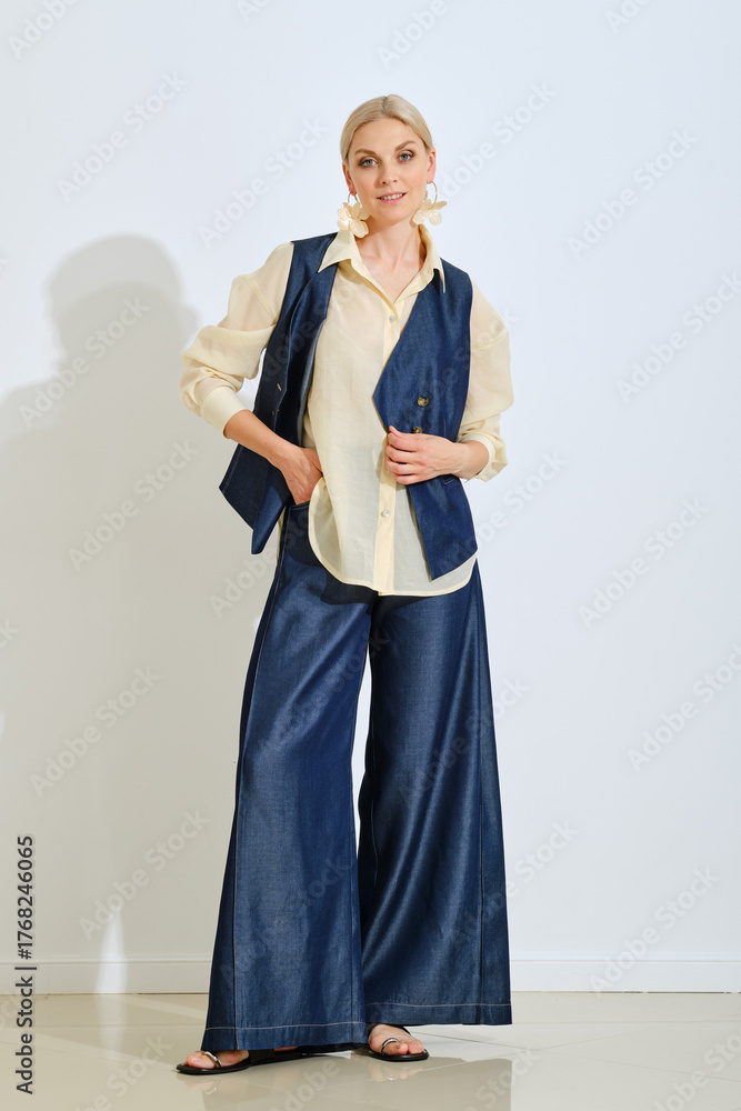 Stylish outfit featuring a denim vest and wide-leg pants in a bright indoor setting