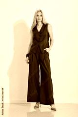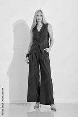 Stylish woman in brown tailored outfit posing confidently against a plain background